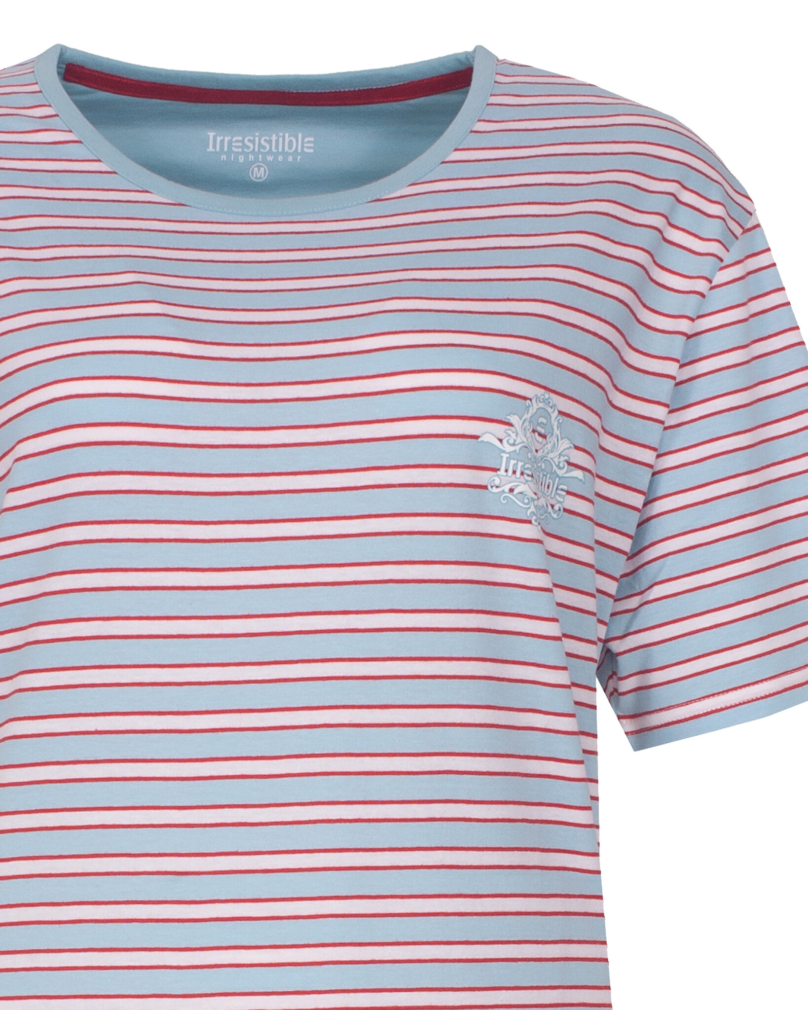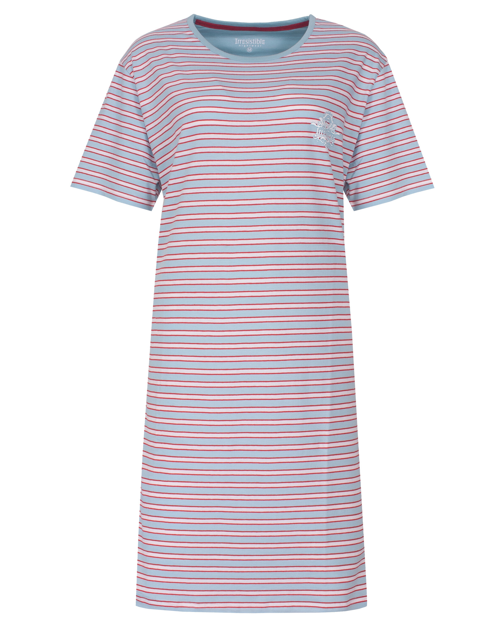 Irresistible Dames Nachthemd Blauw - Dit nachthems is vervaardigd uit 100% gekamd katoen in een comfortabele en rekbare jersey stof. Het nachthemd is gemaakt in fijne ingebreide strepen, is voorzien van een ronde hals met een smalle bies in blauw. Op de linkerborst bevindt zich een kleine print. De zijkanten van de top zijn afgewerkt met een sportieve elastische fijne sierband in wit en rood.