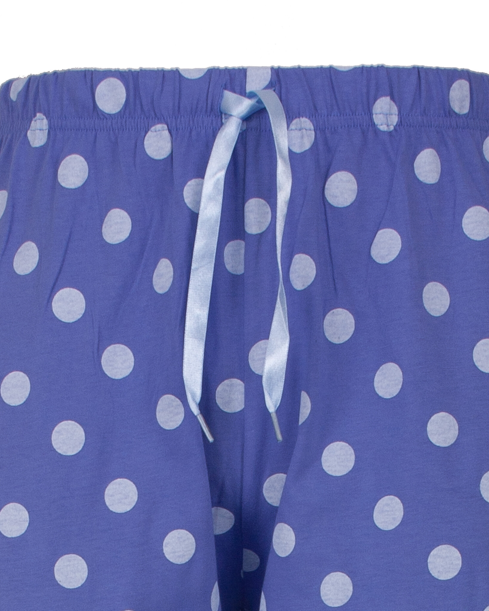 Irresistible Dames Pyjama Blauw - Deze pyjama is vervaardigd uit 100% gekamd katoen in een comfortabele en rekbare jersey stof. De uni blauwe top heeft een ronde hals en lange mouwen die zijn afgewerkt met ribboorden. Op de borst bevindt zich een zachte puffprint. De allover geprinte broek met uni ribboordjes beschikt over elastiek in de taille, inclusief een lichtblauw satijnen aantrekkoord.