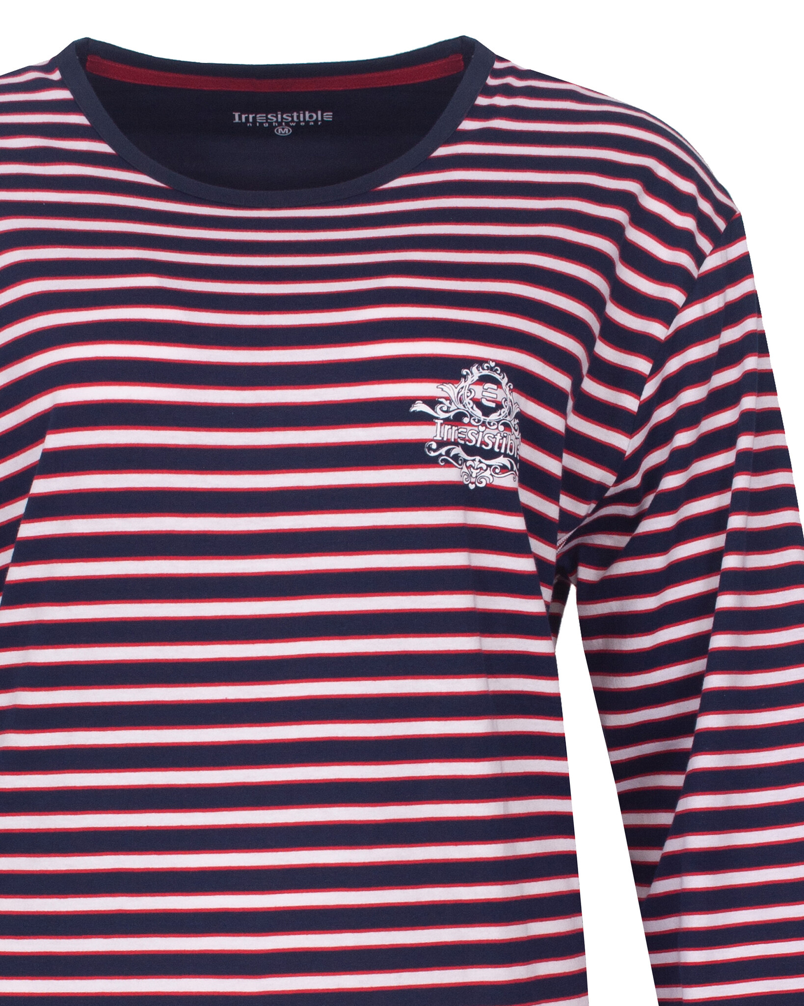 Irresistible Dames Pyjama Donker Blauw - Deze pyjama is vervaardigd uit 100% gekamd katoen in een comfortabele en rekbare jersey stof. De top is vervaardigd uit fijne ingebreide strepen en is voorzien van een ronde hals met een smalle bies in blauw en lange mouwen met ribboorden. Op de linkerborst bevindt zich een kleine print. De zijkanten van de top zijn afgewerkt met een sportieve elastische fijne sierband in wit en rood. De uni blauwe broek met ribboordjes beschikt over elastiek in de taille, inclusief een uni blauw aantrekkoord.