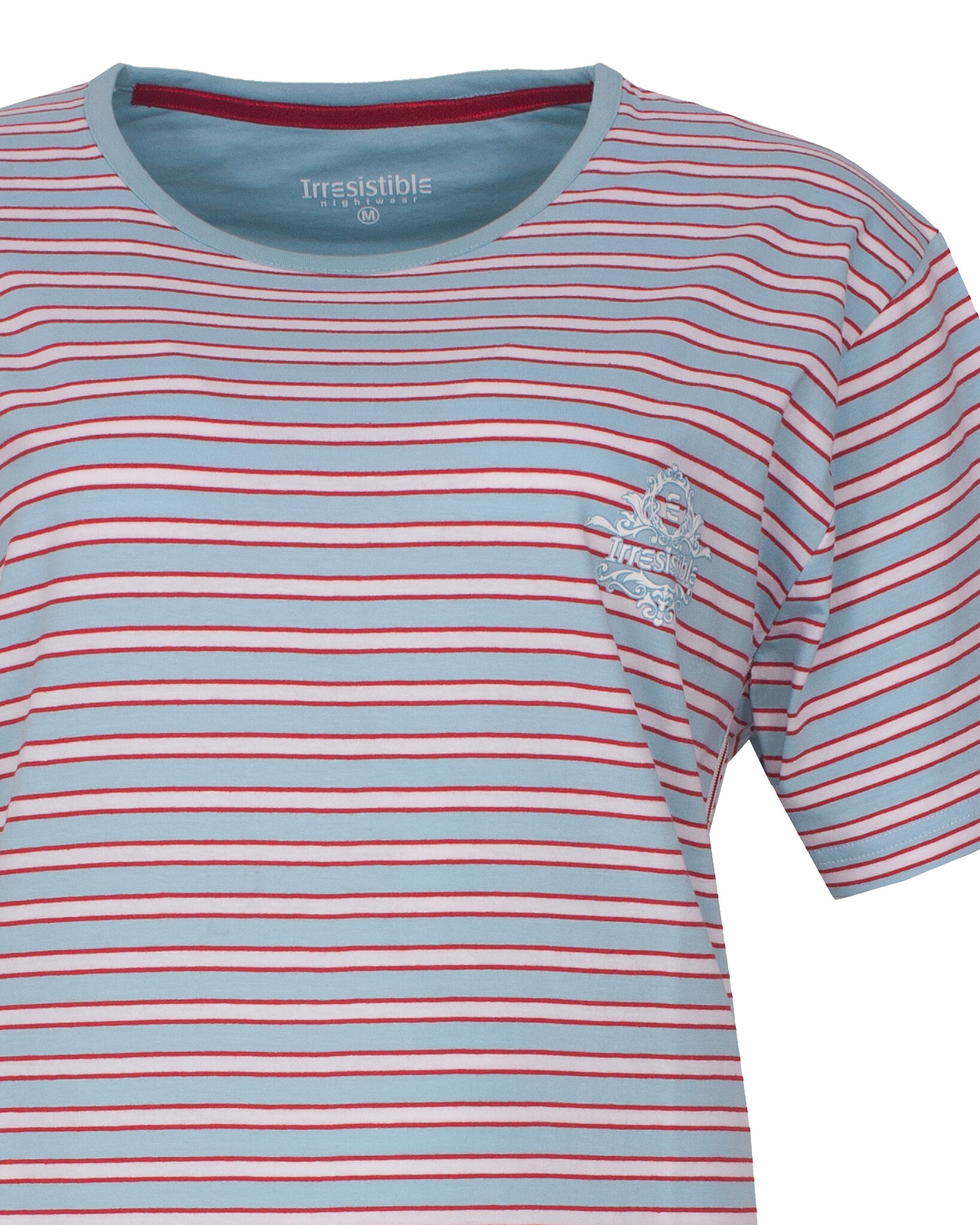 Irresistible Dames Shortama Blauw - Deze shortama is vervaardigd uit 100% gekamd katoen in een comfortabele en rekbare jersey stof. De top is vervaardigd uit fijne ingebreide strepen en is voorzien van een ronde hals met een smalle bies in blauw. Op de linkerborst bevindt zich een kleine logo print. De zijkanten van de top zijn afgewerkt met een sportieve elastische fijne sierband in wit en rood. De uni blauwe broek beschikt over elastiek in de taille, inclusief een blauw aantrekkoord.