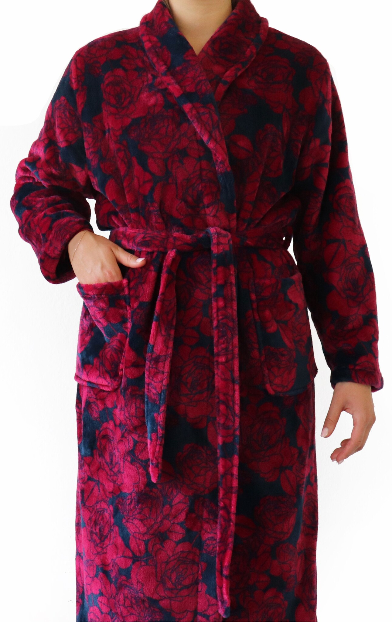 MEBRD25001A Tenderness Fleece Badjas Ochtendjas Blauw Rood- Ochtendjas van Flannel Fleece - 100% Polyester. Geprint in een groot allover rozendessin. Flannel Fleece is heerlijk zacht en behaaglijk. De ochtendjas heeft een sjaalkraag, sluit met een ceintuur en heeft lange mouwen. Op de voorkant bevinden zich 2 royale zakken.