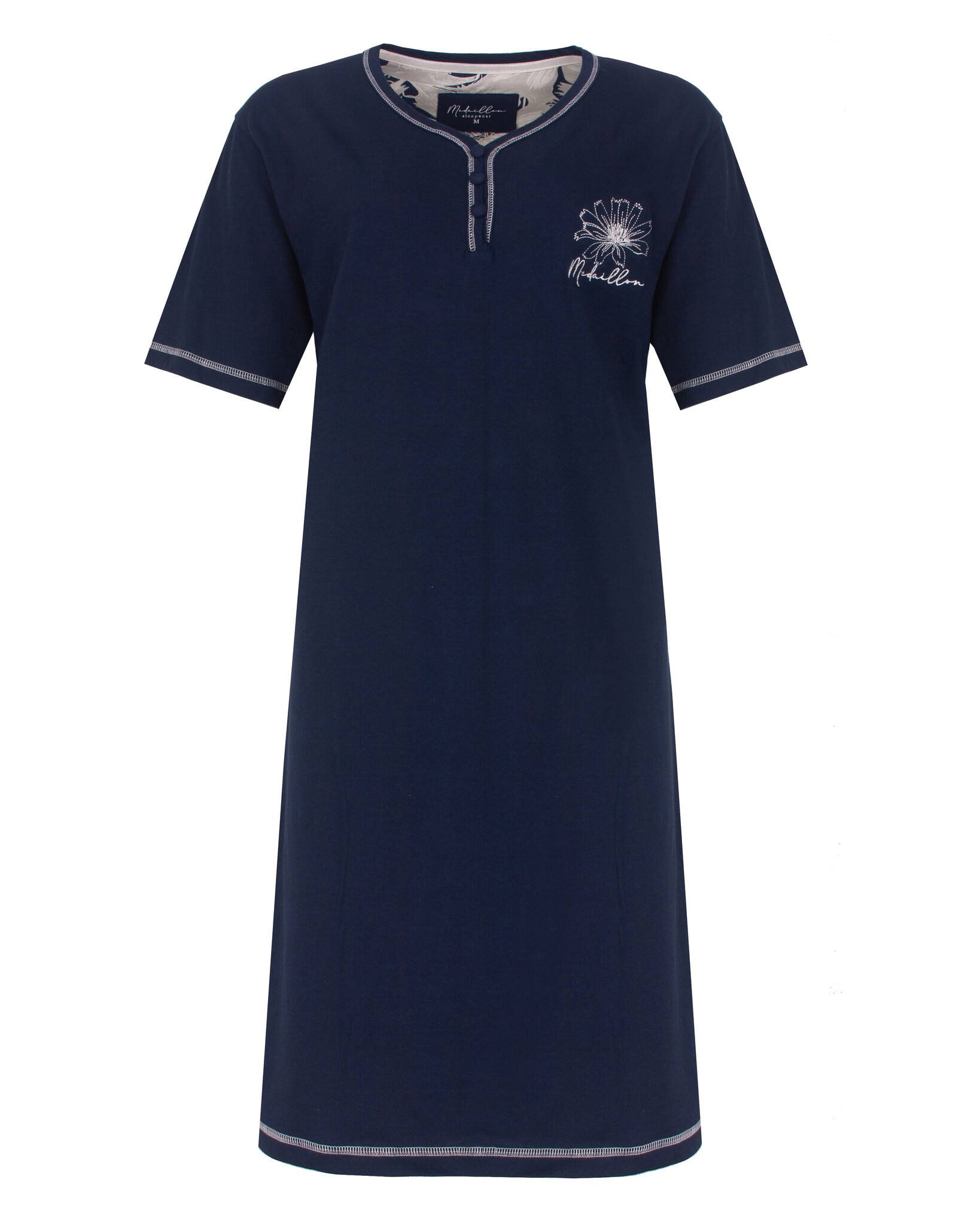 Medaillon Dames Nachthemd - Dit nachthemd is vervaardigd uit 100% gekamd katoen in een comfortabele en rekbare jersey stof. Het uni nachthemd is voorzien van een V-hals die uitloopt in een korte knooplijst met 3 blauwe stofknopen en is afgewerkt met een sierstiksel. Op de borst bevindt zich een elegante borduur met een bloem en logo 'Medaillon'. De korte mouwen zijn ook afgewerkt met een sierstiksel in contrastkleur.