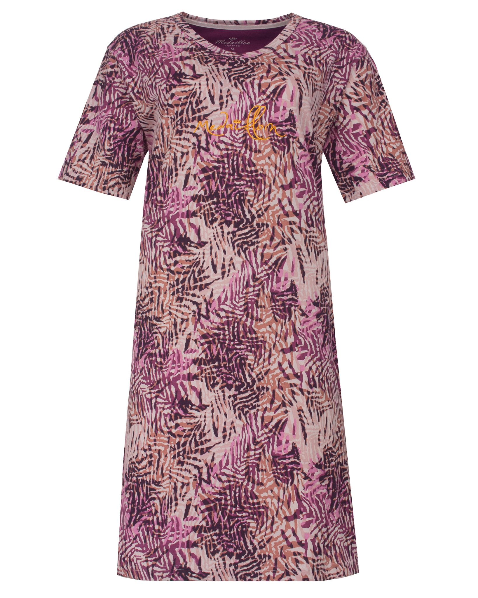Medaillon Dames Nachthemd - Dit nachthemd is vervaardigd uit 100% gekamd katoen in een comfortabele en rekbare jersey stof. Het nachthemd is voorzien van een allover dessin en een rond gesneden V- hals die is afgewerkt met een biesje. Op de voorkant bevindt zich een elegante borduur met het logo 'Medaillon'.
