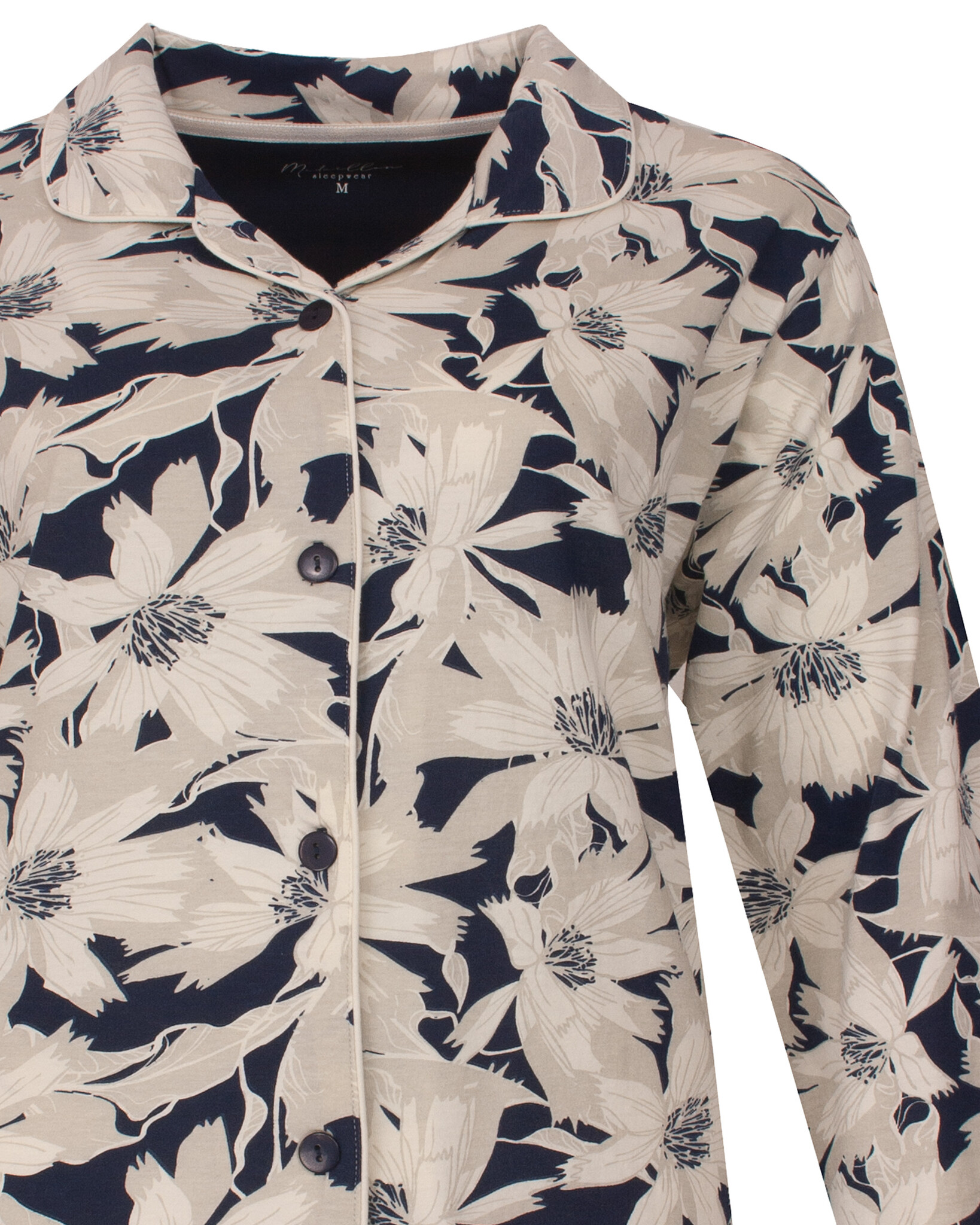 Medaillon Dames Doorknoop Pyjama - Deze pyjama is vervaardigd uit 100% gekamd katoen in een comfortabele en rekbare jersey stof. De allover geprinte top is voorzien van een doorknooplijst met 5 blauwe knopen en is afgewerkt met een fijn satijnen biesje. De lange mouwen zijn afgewerkt met een sierstiksel. De uni lange broek beschikt over elastiek in de taille, inclusief een satijnen aantrekkoord in een contrastkleur en is ook afgewerkt met een sierstiksel.