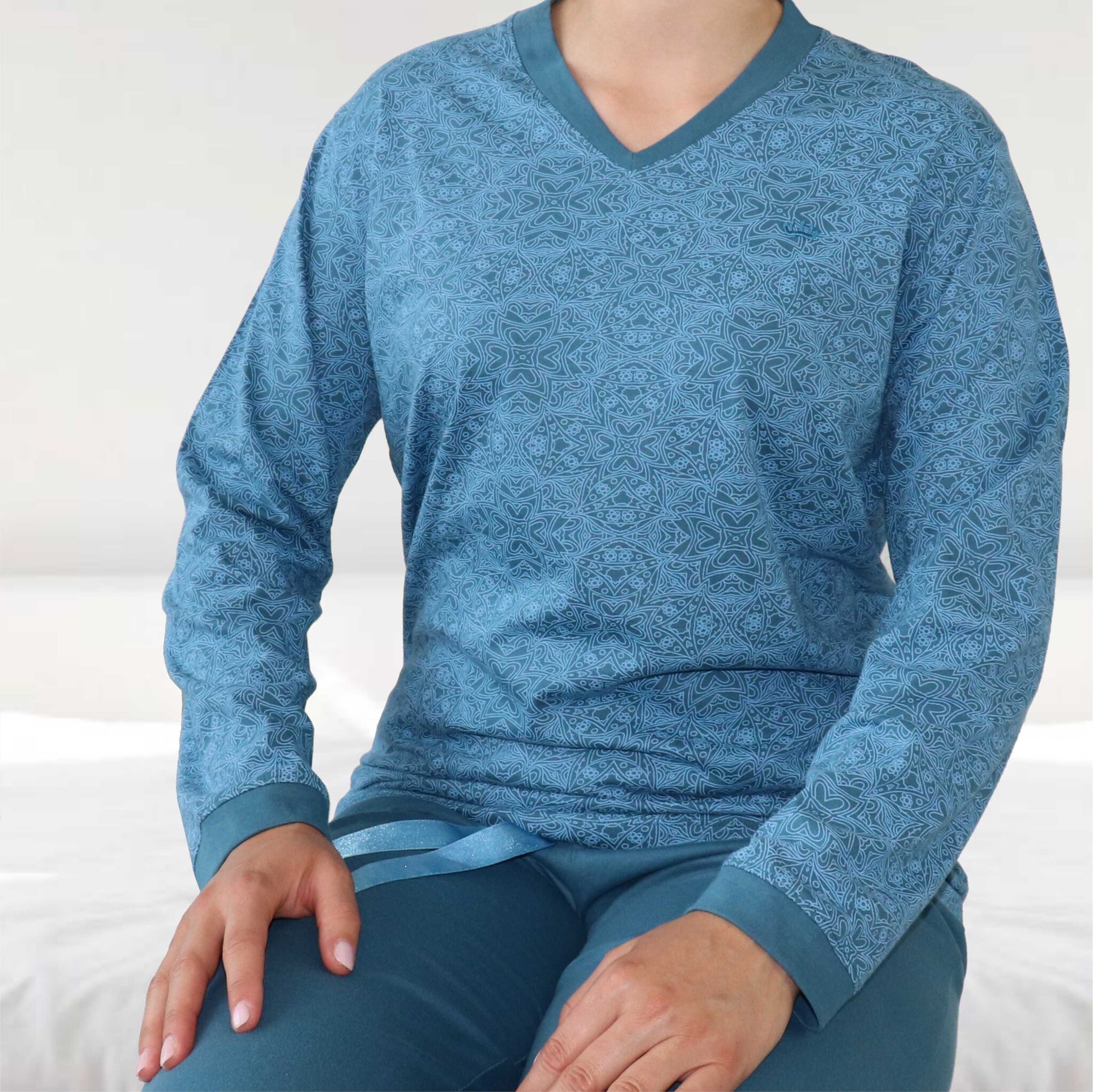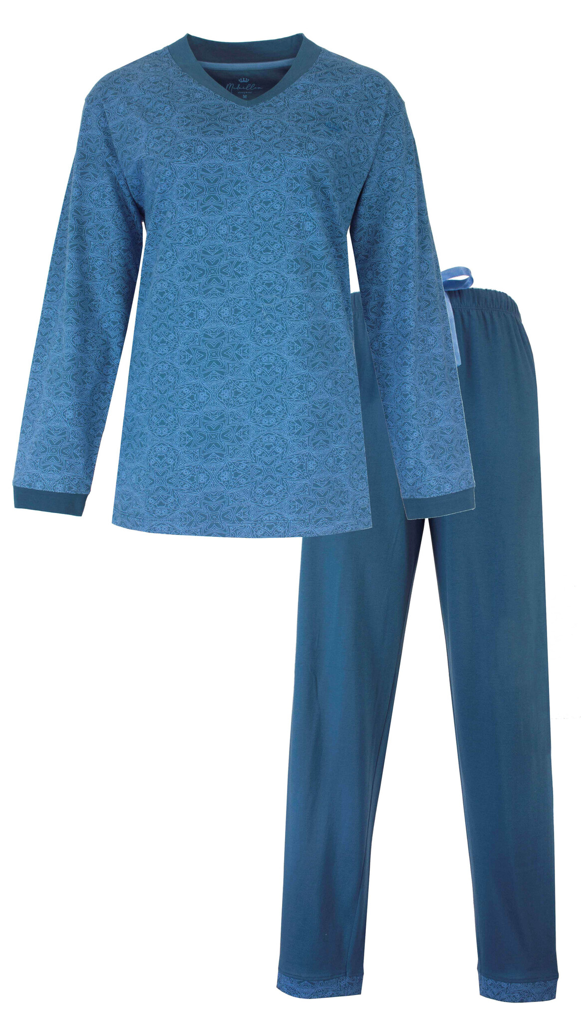 Medaillon dames Pyjama Petrol Blauw - vervaardigd uit 100% gekamd katoen voor een uitstekende draagervaring. Deze pyjama is ontworpen in een comfortabele en rekbare jersey-kwaliteit. De top heeft een fijne alloverprint en beschikt over een uni V-hals in een subtiele vorm. Op de borst bevindt zich een klein geborduurd ton-sur-ton Medaillon logo. De mouwen zijn afgewerkt met een boordje in hetzelfde materiaal als de hals.