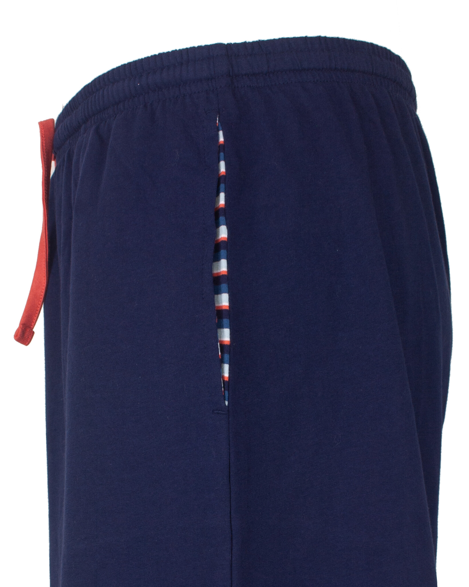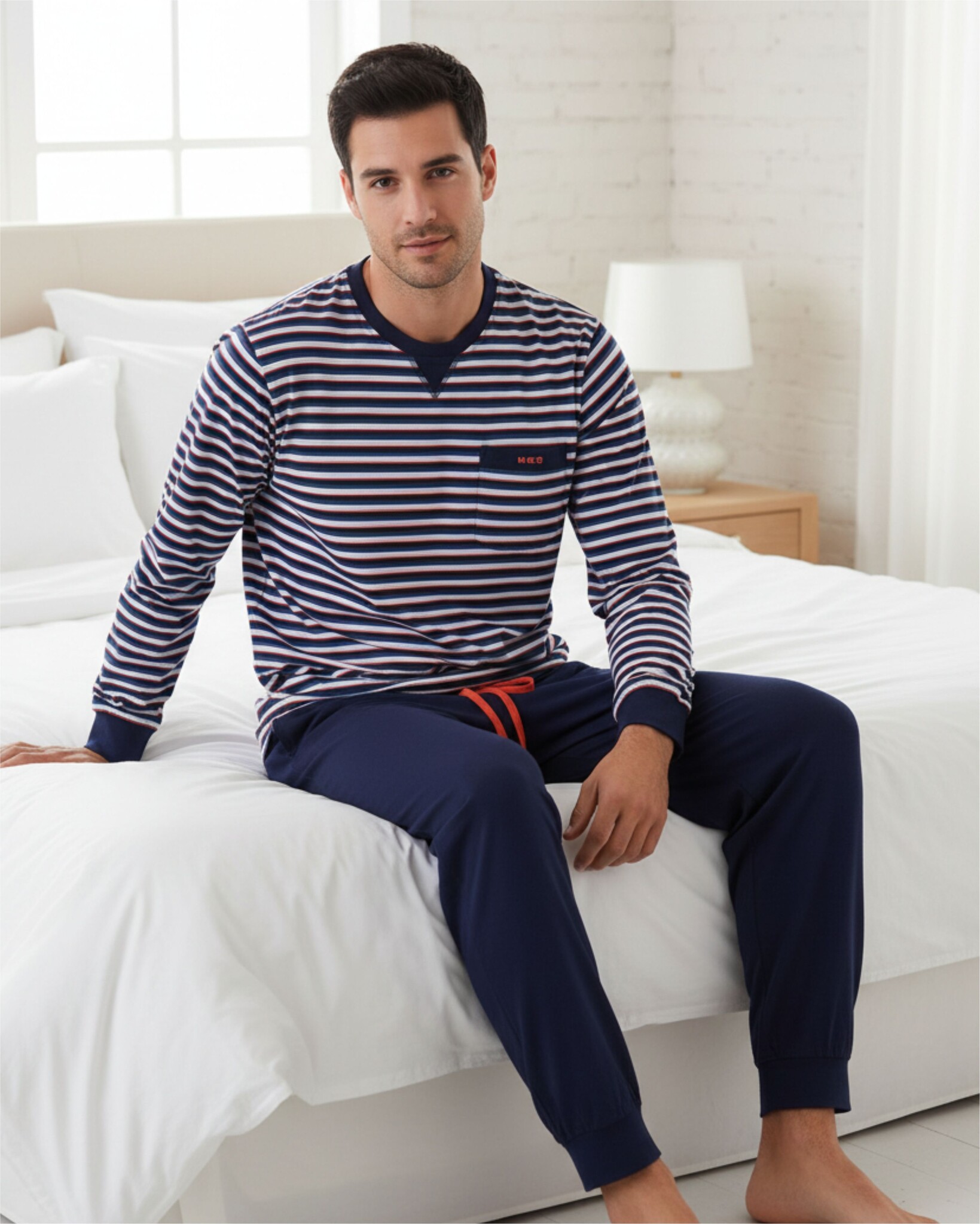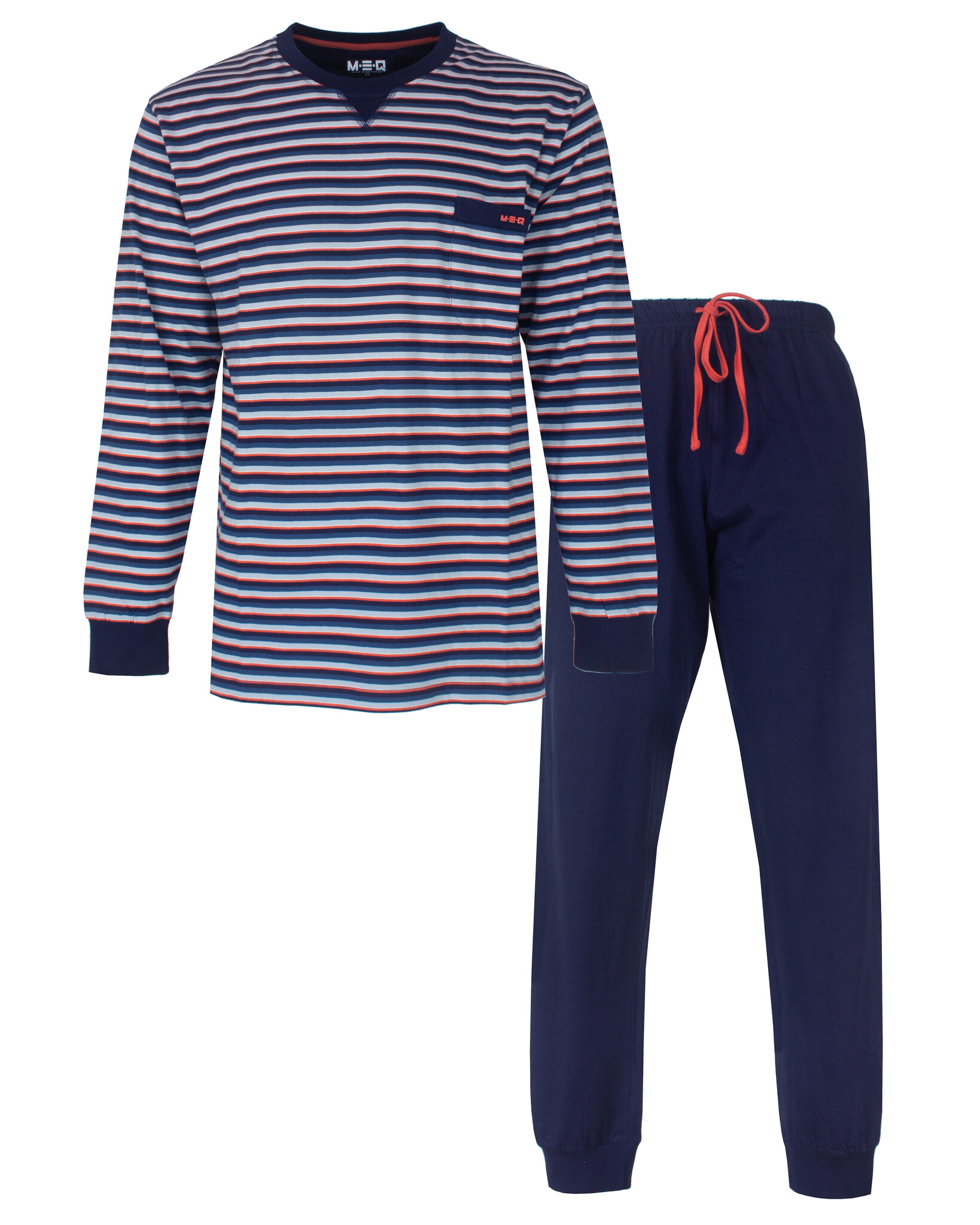 M.E.Q. Heren Pyjama Blauw- Deze pyjama is vervaardigd uit 100% gekamd katoen in een comfortabele en rekbare jersey stof. De gestreepte (yarn-dyed) top heeft een ronde hals met een inzetstukje en op de borst bevindt zich een borstzakje met klein geprint 3D MEQ logo. De lange mouwen zijn afgewerkt met een elastisch ribboord. De uni lange broek beschikt over elastiek in de taille, inclusief een aantrekkoord en is afgewerkt met elastische ribboorden en handige zakken in de zijnaad. Samen met de top creëert dit een praktische en comfortabele set.