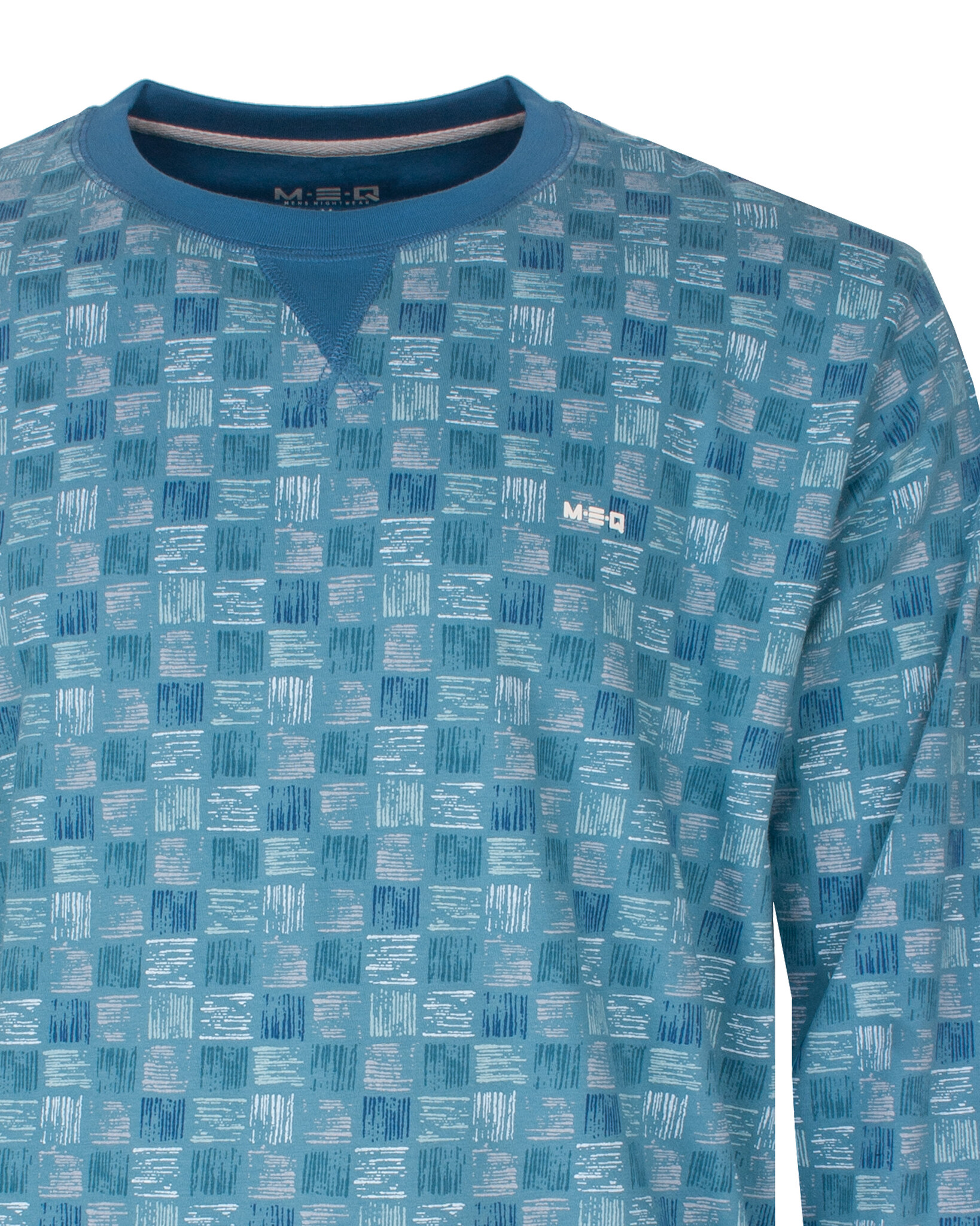 M.E.Q. Heren Pyjama Aqua Blauw- Deze pyjama is vervaardigd uit 100% gekamd katoen in een comfortabele en rekbare jersey stof. De top heeft een ronde hals met een inzetstukje, afgewerkt met een sierstiksel en op de borst bevindt zich een klein geprint 3D MEQ logo. De lange mouwen zijn afgewerkt met een elastisch ribboord. De uni lange broek beschikt over elastiek in de taille, inclusief een aantrekkoord en is afgewerkt met elastische ribboorden en handige zakken in de zijnaad. Samen met de top creëert dit een praktische en comfortabele set.