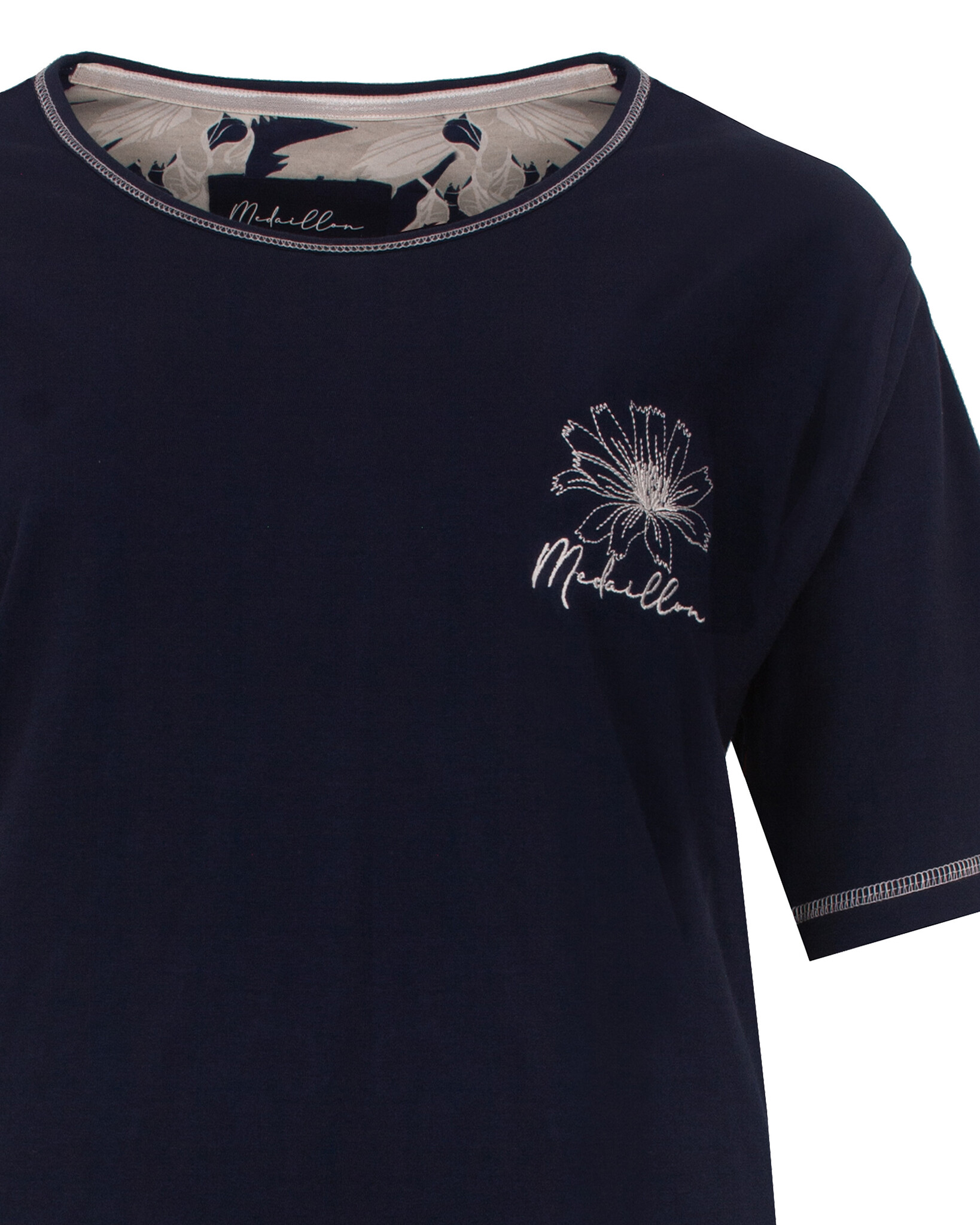 Medaillon Dames Shortama - Deze shortama is vervaardigd uit 100% gekamd katoen in een comfortabele en rekbare jersey stof. De uni top is voorzien van een ronde hals die is afgewerkt met een sierstiksel en op de borst bevindt zich een elegante borduur met een bloem en logo 'Medaillon'. De korte mouwen zijn ook afgewerkt met een sierstiksel in contrastkleur. De allover geprinte korte broek beschikt over elastiek in de taille, inclusief een satijnen aantrekkoord in een contrastkleur.