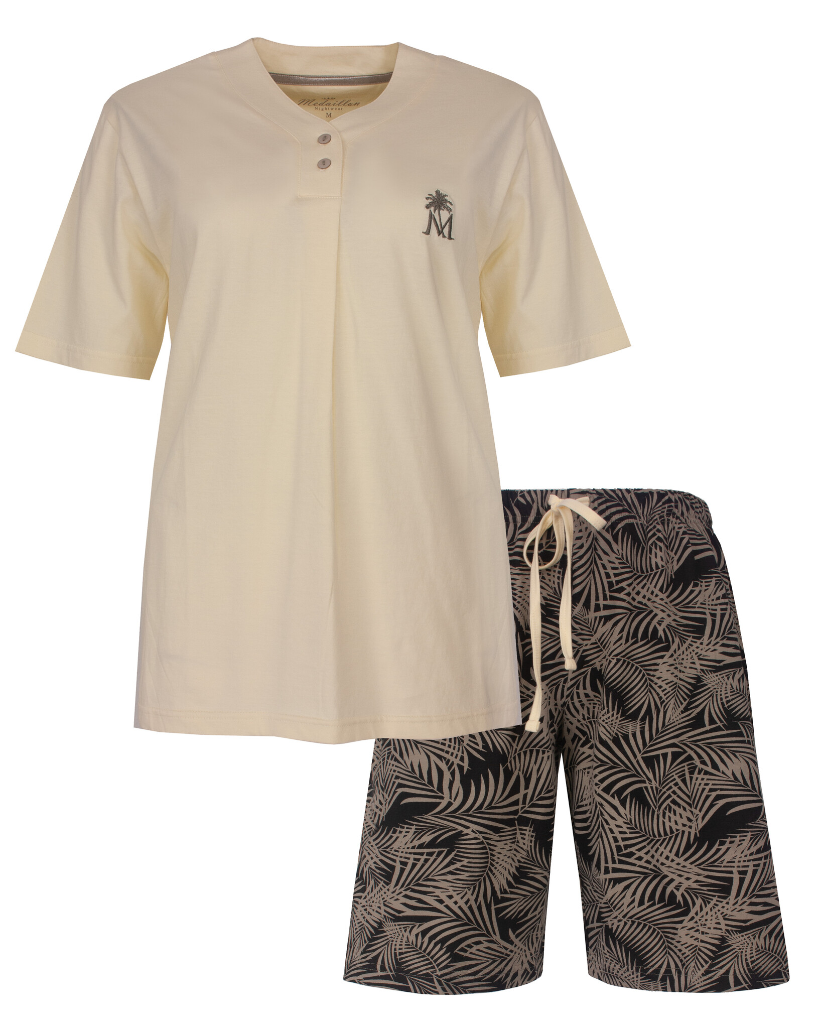 Medaillon Dames Shortama - Deze shortama is vervaardigd uit 100% gekamd katoen in een comfortabele en rekbare jersey stof. De uni top is voorzien van een knoopsluiting met plooi- detail en afgewerkt met een brede bies. Op de borst bevindt zich een elegante borduur met het logo 'M'. De allover geprinte korte broek beschikt over elastiek in de taille, inclusief een aantrekkoord in een contrastkleur.