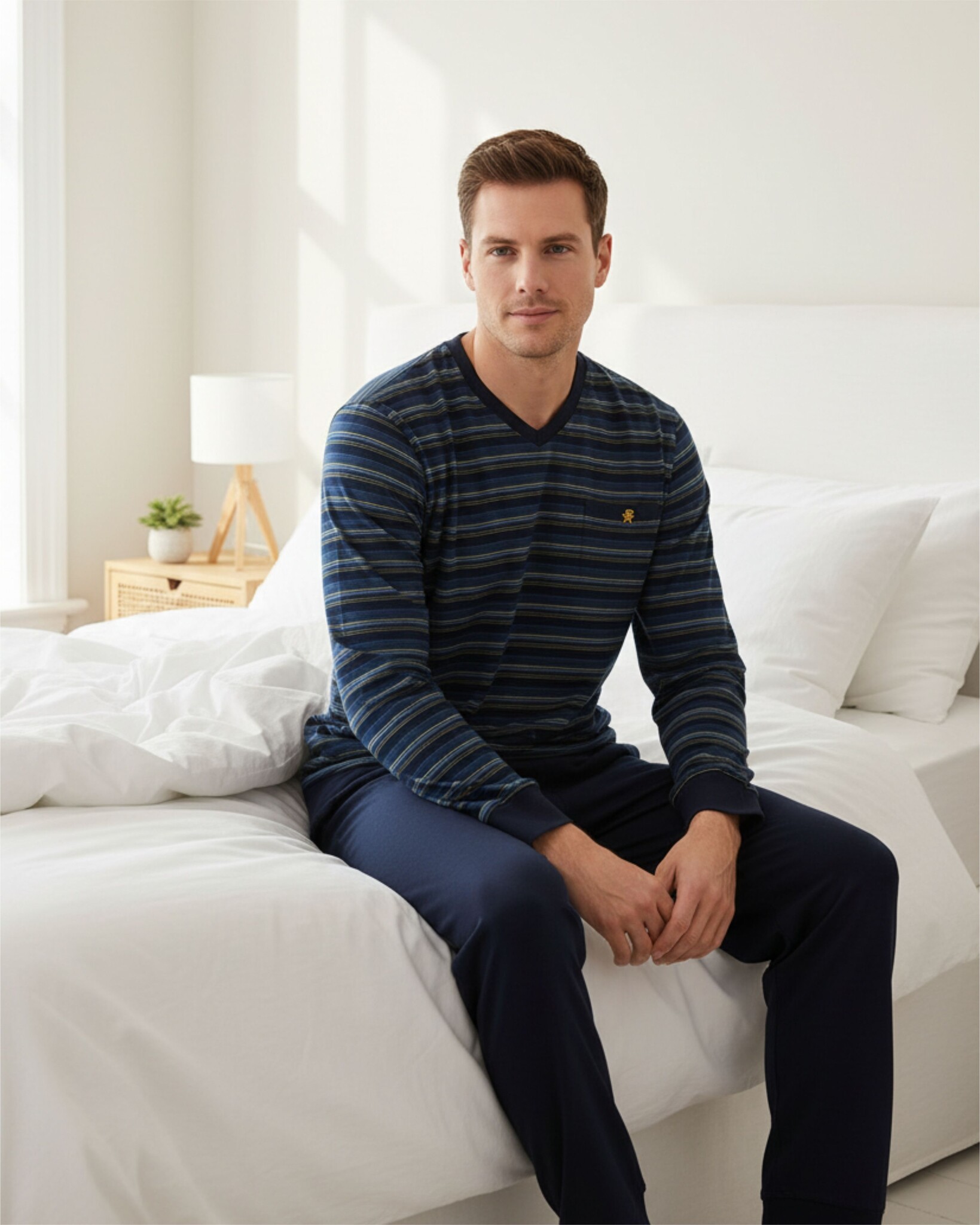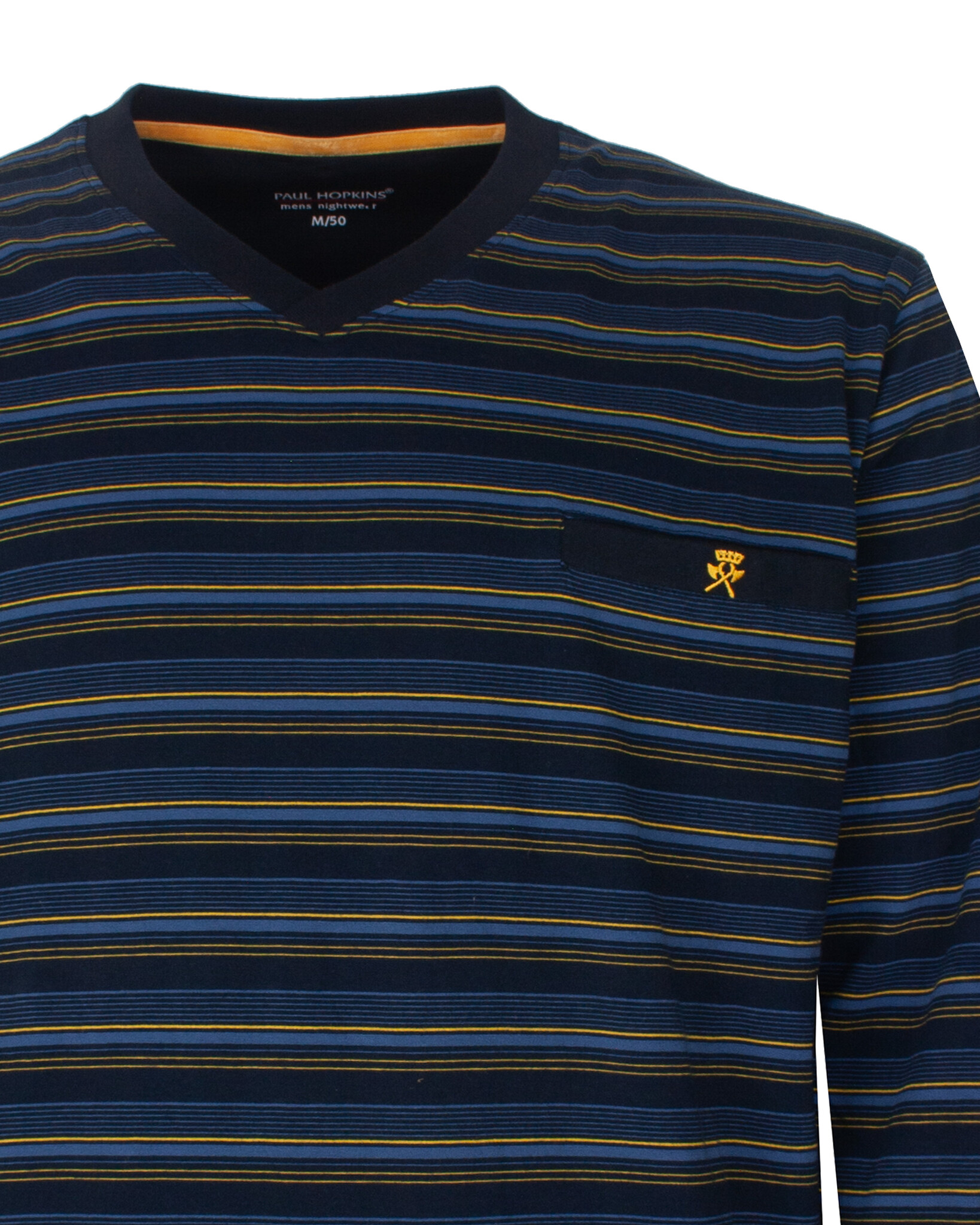 PHPYH16008A Paul Hopkins Heren Pyjama Gestreept V-hals Donker Blauw.