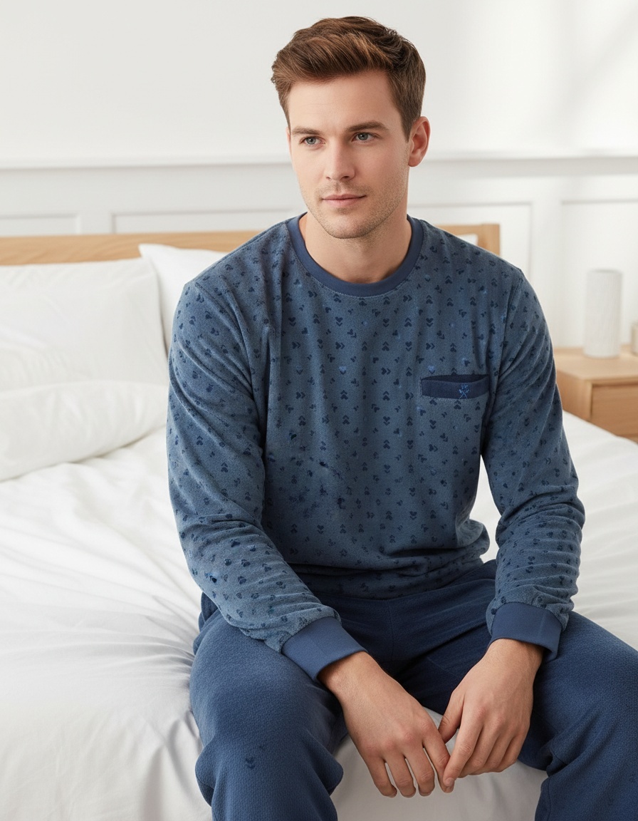 Paul Hopkins Heren Badstof Pyjama Blauw - Deze Heren Pyjama Set, met stijlvolle minimalistische print, is gemaakt van een zachte blend van 80% gekamd katoen en 20% polyester badstof. De rekbare badstof kwaliteit van de pyjama zorgt voor een perfecte pasvorm, waardoor u zowel comfort als bewegingsvrijheid heeft tijdens uw slaap.