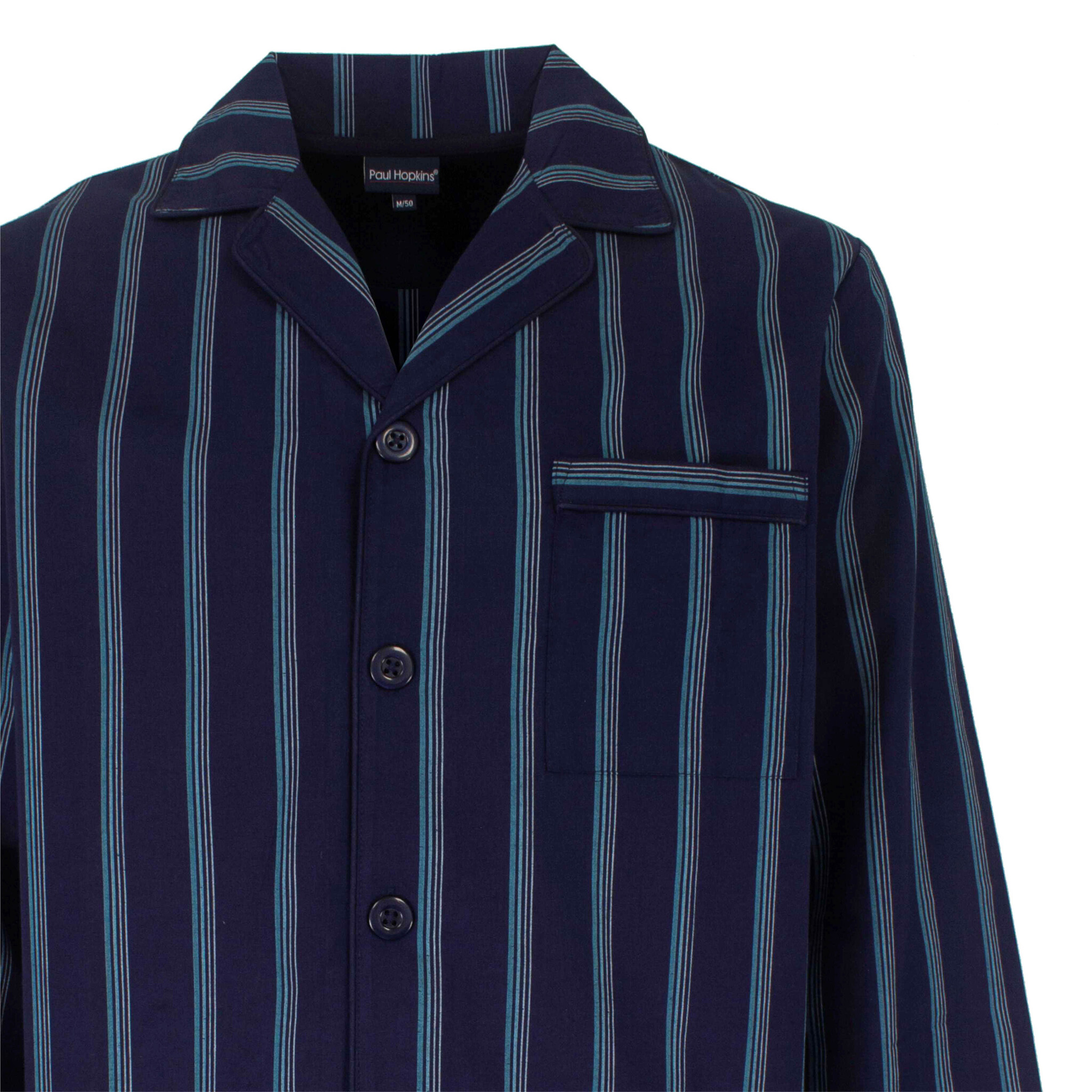 Paul Hopkins Heren Pyjama - vervaardigd uit 100% katoen geweven poplin. Deze klassieke doorknoop pyjama belichaamt zowel stijl als comfort. Het bovenstuk is voorzien van een elegante reverskraag, afgewerkt met een subtiel biesje en uitgevoerd in een verfijnd verticaal strepen dessin. De top heeft lange mouwen en op de borst bevindt zich een borstzakje met een geborduurd Paul Hopkins logo. De lange, uni broek garandeert optimaal comfort en is uitgerust met een authentieke knoopgulp en praktische zijzakken.
