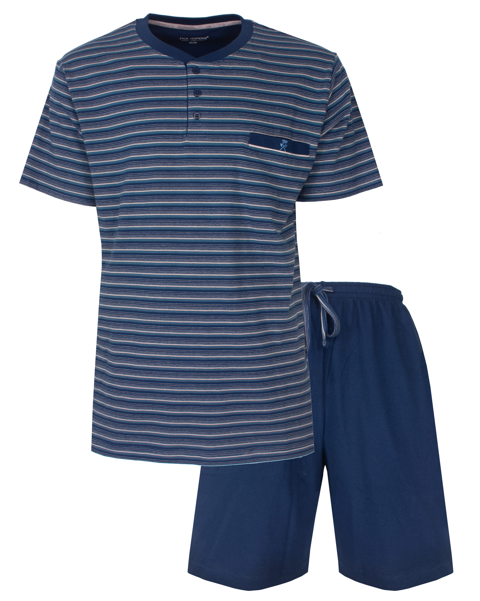 Paul Hopkins Heren Shortama - Deze shortama is vervaardigd uit 100% gekamd katoen in een comfortabele en rekbare jersey stof. De gestreepte (yarn-dyed) top is voorzien van een ronde hals met een polosluiting met 3 blauwe knopen en heeft korte mouwen. Op de borst bevindt zich een paspel borstzakje met een klein geborduurd logo. De korte uni broek heeft zakken in de zijnaad en in de taille een aantrekkoord.