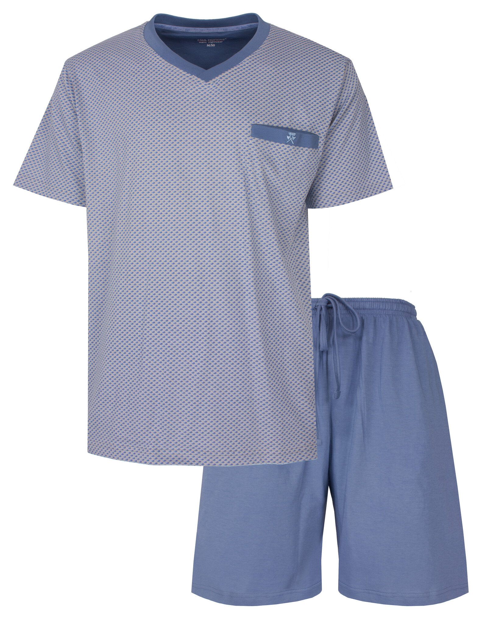 Paul Hopkins Heren Shortama - Deze shortama is vervaardigd uit 100% gekamd katoen in een comfortabele en rekbare jersey stof. De allover geprinte top is voorzien van een V-hals en heeft korte mouwen. Op de borst bevindt zich een paspel borstzakje met een klein geborduurd logo. De korte uni broek heeft zakken in de zijnaad en in de taille een aantrekkoord.