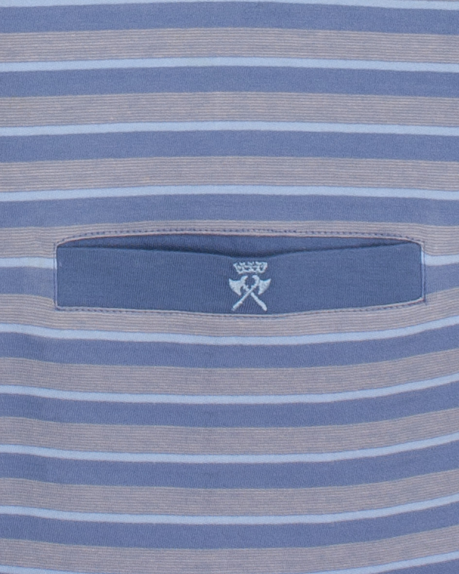 Paul Hopkins Heren Shortama - Deze shortama is vervaardigd uit 100% gekamd katoen in een comfortabele en rekbare jersey stof. De gestreepte (yarn-dyed) top is voorzien van een ronde hals met een polosluiting met 3 blauwe knopen en heeft korte mouwen. Op de borst bevindt zich een paspel borstzakje met een klein geborduurd logo. De korte uni broek heeft zakken in de zijnaad en in de taille een aantrekkoord.