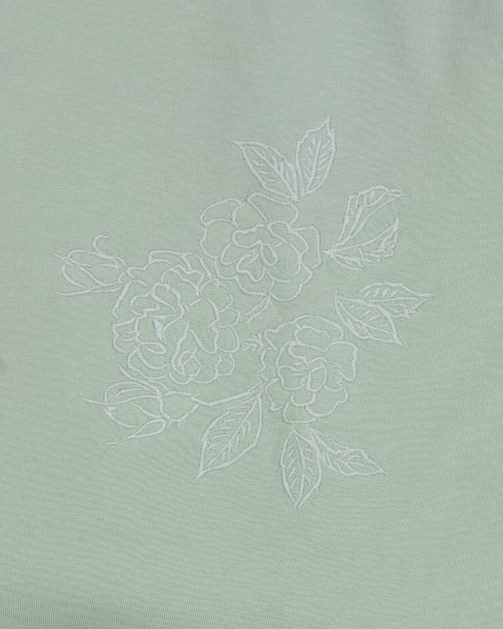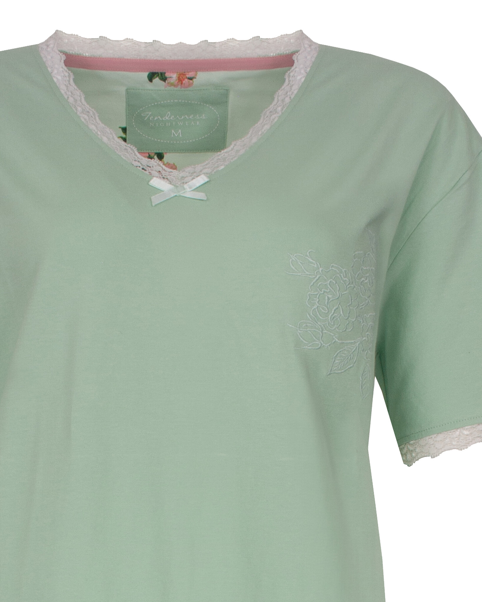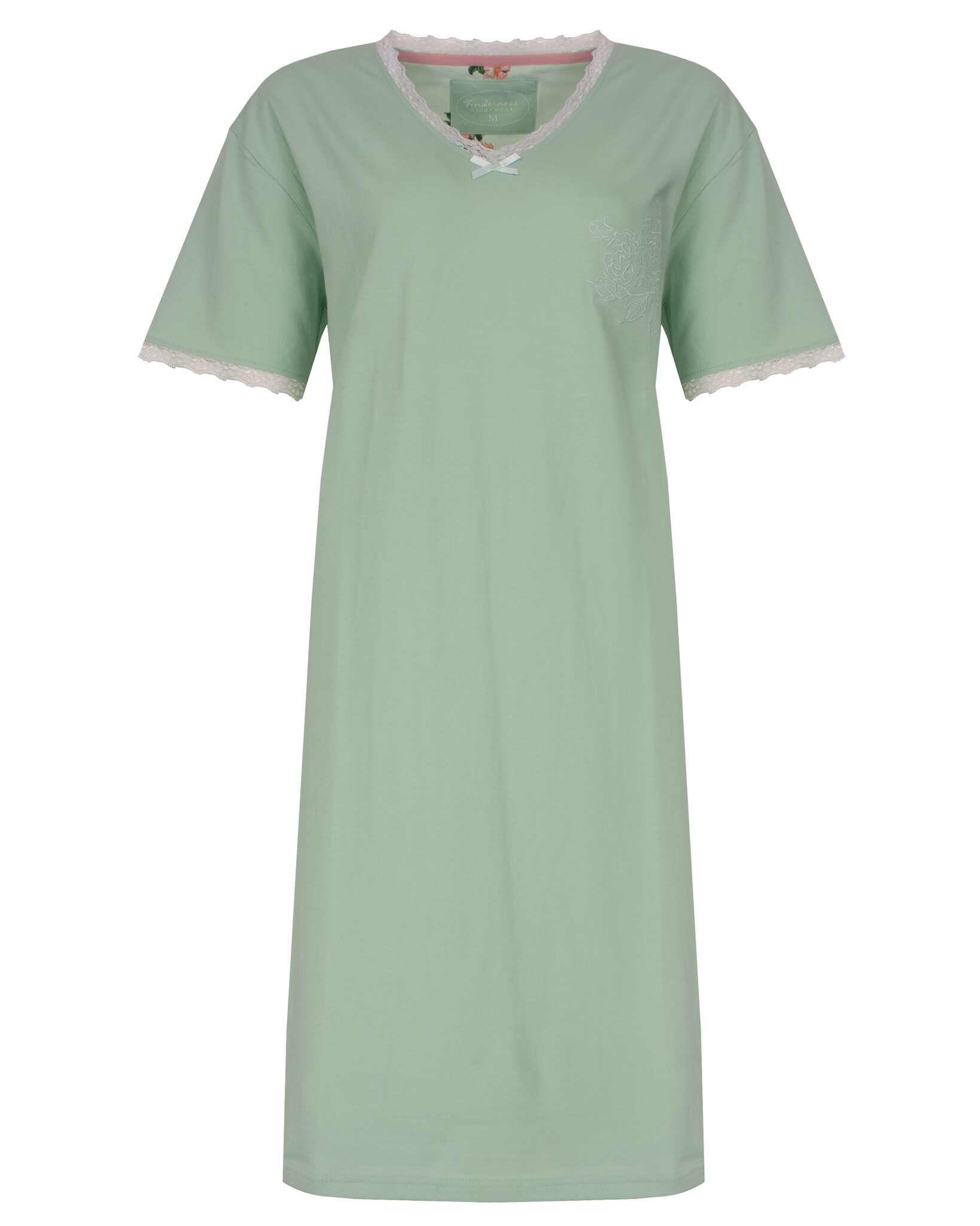 Tenderness dames nachthemd groen– Dit nachthemd is vervaardigd uit 100% gekamd katoen in een comfortabele en rekbare jersey stof. Het nachthemd heeft een V-hals en is elegant afgewerkt met een kanten biesje & satijnen strikje en een fraai geborduurd bloemendessin op de borst, wat zorgt voor een luxe uitstraling. Het nachthemd heeft korte mouwen die ook zijn afgewerkt met kant.