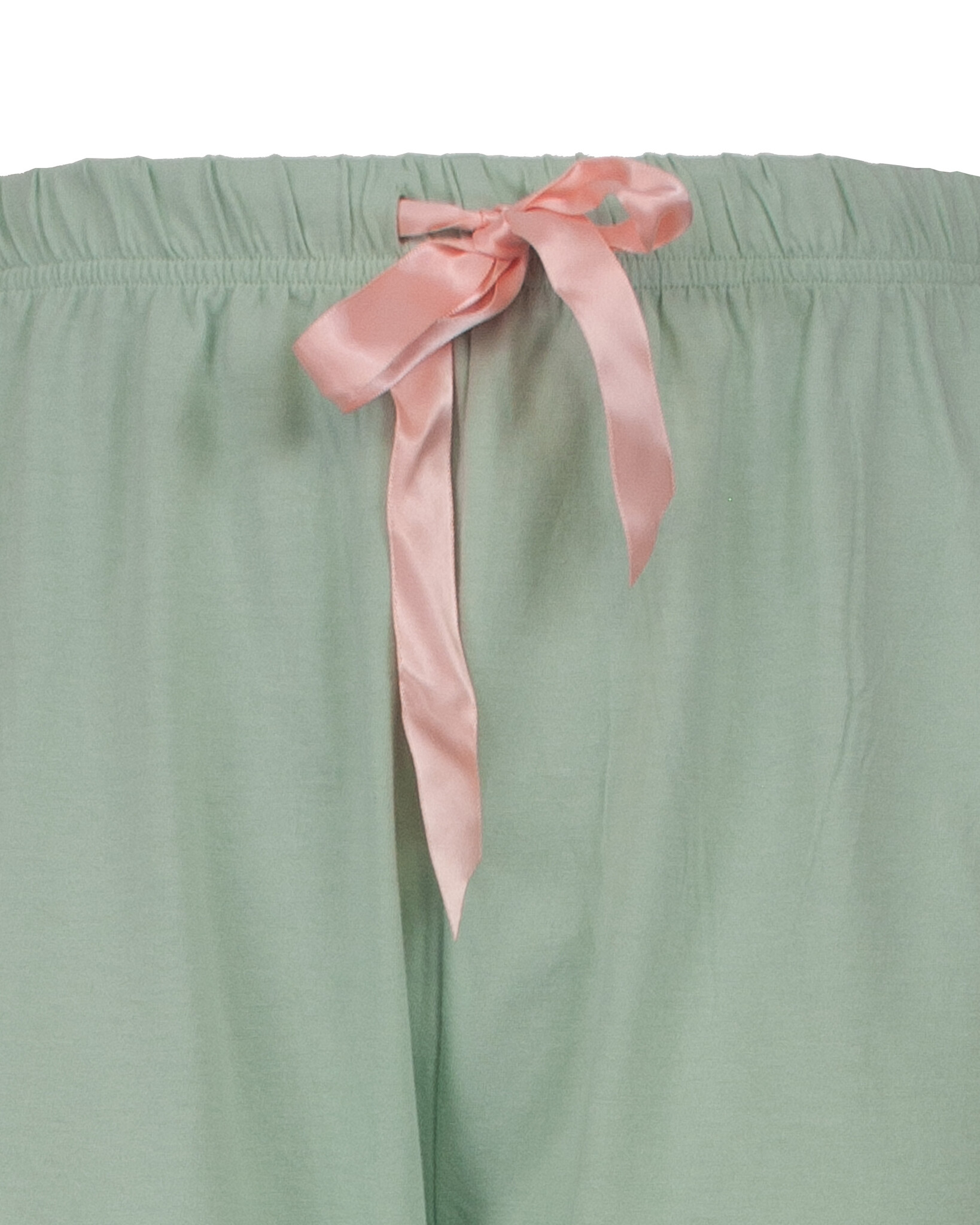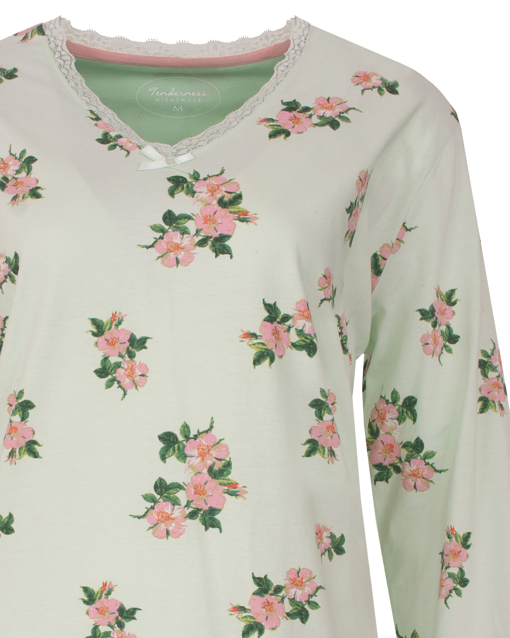 Tenderness Dames Pyjama Groen – Deze pyjama is vervaardigd uit 100% gekamd katoen in een comfortabele jersey stof. De top met allover geprinte bloemendessin heeft een V-hals en is elegant afgewerkt met een kanten biesje en satijnen strikje, wat zorgt voor een luxe uitstraling. De top heeft korte mouwen die ook zijn afgewerkt met kant. De bijpassende uni lange broek heeft een aantrekkoord in de taille en is voorzien van een satijnen aantrekkoord in contrasterend roze.