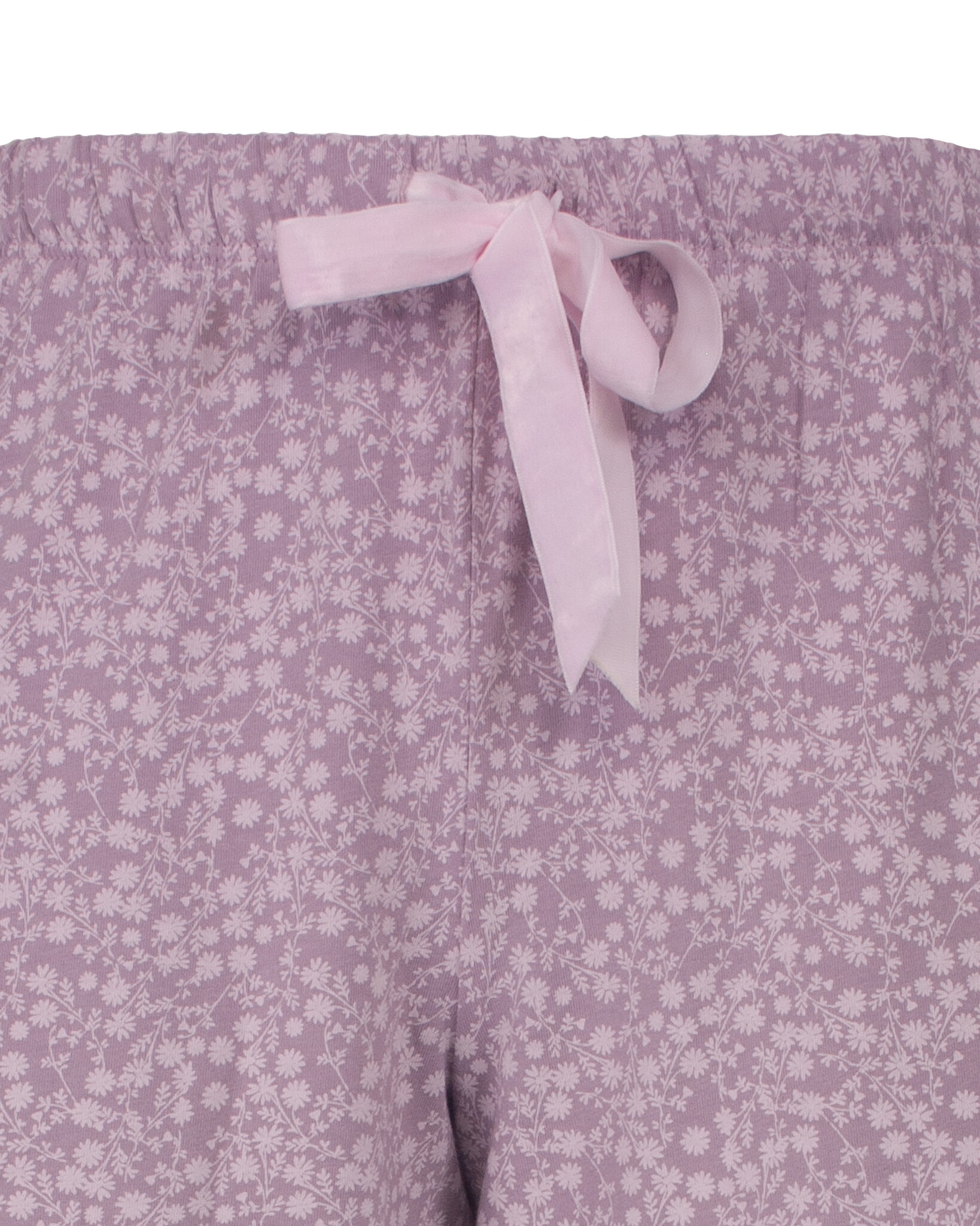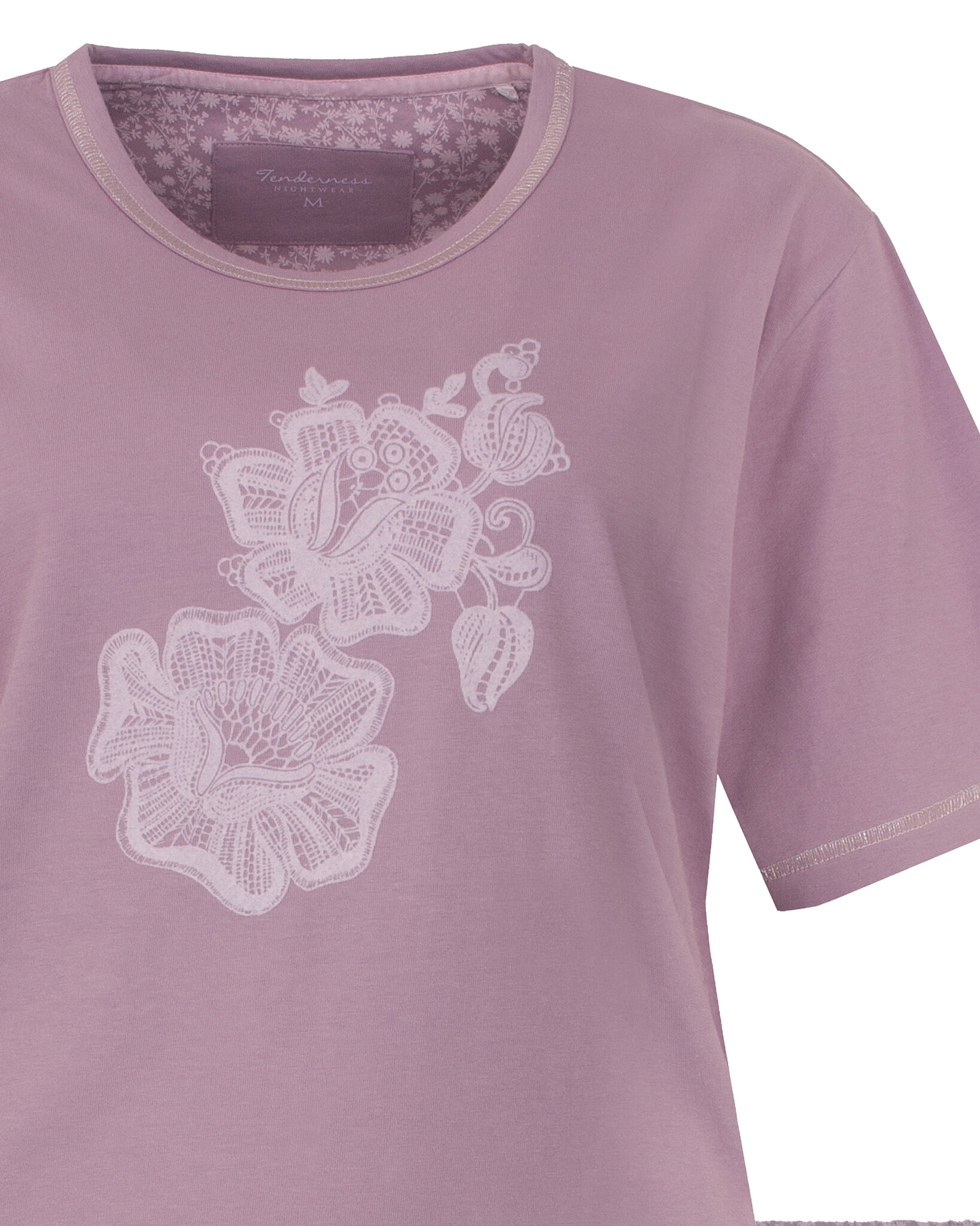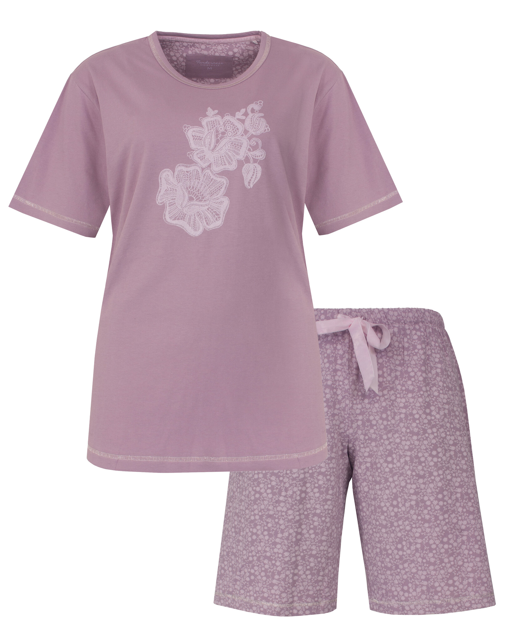 Tenderness Dames Shortama Lila - Deze shortama is vervaardigd uit 100% gekamd katoen in een comfortabele en rekbare jersey stof. De uni top is voorzien van een ronde hals die elegant is afgewerkt met een smal biesje met een fijn zilveren sierstiksel. Op de top bevindt zich een zachte flockprint. De korte mouwen zijn ook afgewerkt met een zilveren sierstiksel. De allover geprinte broek beschikt over elastiek in de taille, inclusief een zacht velours aantrekkoord in de contrastkleur roze.