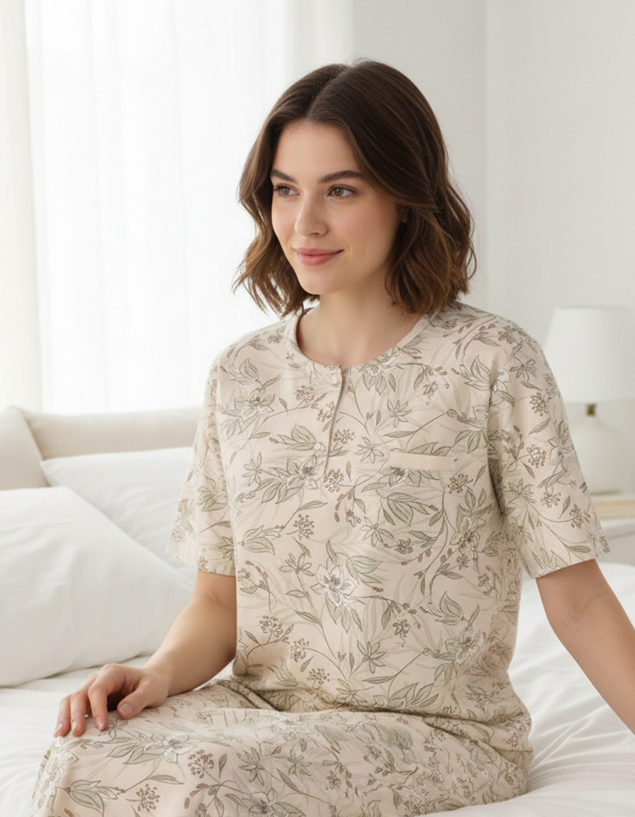 Tenora dames nachthemd – slaapkleed gemaakt van 100 % katoen. Dit nachthemd is gemaakt in een draagbare en rekbare jersey kwaliteit. Gebloemd met een ronde hals met knoopjes en korte mouwen. Ruimvallend nachthemd met een lengte van 110 CM. Valt onder de knie.